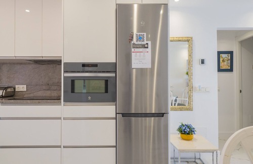 The apartment has a bright living-dining room with direct access to a glazed terrace equipped with outdoor furniture so you can enjoy the sea breeze and views at any time of the day. The open-plan kitchen is fully equipped with modern appliances: fridge, microwave, oven, dishwasher, coffee maker, toaster, juicer and more, making meal preparation easier.
