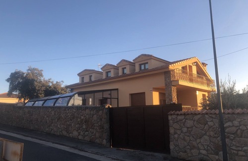 Great totally independent villa, has a heated pool for use 365 days a year fenced with natural stone and that provides total privacy. 6 bedrooms, living room, kitchen, cellar, games room, large garden, heated pool all year. 5 bathrooms, outdoor barbecue area with bar to enjoy, firewood in charge of the house, located in the preserve of San Isidro, less than 1 hour from Madrid, very well connected, near supermarket and restaurant.