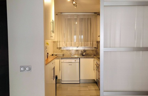 The fully equipped kitchen is accessed via a sliding door from the living room. The kitchen is equipped with dishwasher, washing machine, microwave, fridge / freezer, ceramic hob and oven.