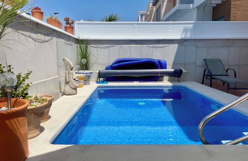 The property has a secure lockable entrance gate and a front terrace with private plunge pool with steps (not ladder) for easy access. There is space for three to four sunbeds to lounge in the sun by the side of your pool, and also a table and chairs for 'al fresco' dining. Please do not move furniture to park on the front terrace as it is not designed to take the weight of a vehicle. There is plenty of parking in the road directly in front of the villa.