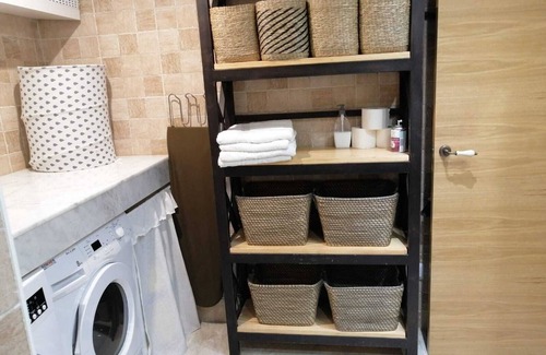 As you settle into this 1-bedroom, 1-bathroom rental, you'll find a sofa bed and air conditioning. The kitchen is equipped with an oven, a stovetop, and a refrigerator, as well as a coffee maker, an electric kettle, and a microwave. And because there's a washer and dryer, you can go a bit lighter on your packing.