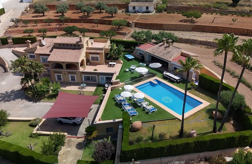Surrounded by vineyards in a secluded location, this luxurious 7-bedroom villa feels like its own private estate with sleeping space for up to 16 (18 with bungalow).Perfect for a large family or group of friends, the villa has 400 m2 of interior space with two separate floors containing their own living area, bedrooms, bathroom and fully equipped kitchen. There\'s also an independent studio above the villa that\'s ideally suited for a small family looking for their own privacy.This stunning property also has a huge 5,000 m2 garden with a pool that’s big enough for everyone to swim and play games. Outdoor dining areas and a large terrace with a summer kitchen offer the opportunity for lazy BBQs on warm Spanish evenings, and the villa is also pet-friendly.The Inside Space: On the ground floor, an open living/dining area offers plenty of space to hang out as a group. In the living area, matching cream sofas offer a comfy spot to snooze or read. Steps away, a glass-top dining table offers seating for six.As well as a large kitchen, the ground floor also features two separate bathrooms and two spacious bedrooms - one of which has a double bed while the other features two singles.The equally impressive main floor feels wonderfully light and airy. A contemporary living room is furnished with soft sofas, a flat-screen TV and classic Mediterranean touches. The room leads to a dining area with a table that seats four, while a fully equipped kitchen offers plenty of appliances and prep space to cook up a Spanish feast.There are also three double bedrooms on this floor, two of which have a pair of twin beds and another bedroom has a double bed and private bathroom. An additional bathroom on this floor has a WC and a bathtub.Finally, an independent studio (accessed via an external staircase) comes with a double bedroom, full bathroom with shower, kitchenette and bunk bed.The Outdoor Space: With a 5,000 m2 garden, the kids have tons of space to play - and grown-ups can watch them have fun while lazing beneath the shade of a palm tree.Everyone can enjoy splashing around in the villa\'s secured 12x6 meter pool. But if all that sounds like hard work, you can always kick back in a sunlounger or enjoy a little privacy on a shaded terrace.The villa also has multiple sitting and dining areas, its own wood-fired pizza oven, and a summer kitchen. In the evenings, grill up fresh seafood and steaks beside the pool, then pour a glass of ice-cold sangria just in time for sunset.The Surrounding Area: If you want to swap lounging by the pool for lazing beside the sea, hop in the car and take a 15-minute drive to Moraira, or drive the same distance to Calpe. This pretty coastal town has two long sandy beaches to chill out on, and the town is also home to plenty of local restaurants, cafes, a great shopping district, and an historic old town with ancient Roman and Moorish ruins.Fancy a change from the sea and sand lifestyle? Hurtle down heart-thumping roller coasters at the sprawling theme park of Terra Mitica, or tear down epic water rides at Aqualandia - one of the biggest water parks in Europe. Both destinations are within a 35-minute drive away.Nº Licencia Turístico: VT-453751-ACosta Blanca and Costa CarpeDiem are waiting for you!Interior of the main accommodation of this luxury villa