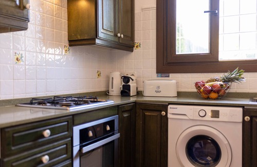 The U- shaped kitchen is well equipped and complete with all the modern appliances you need - including fridge/freezer, microwave, coffee machine and more. From the window of the kitchen you can look out to the pool area. There is also an indoor dining area inside the house.